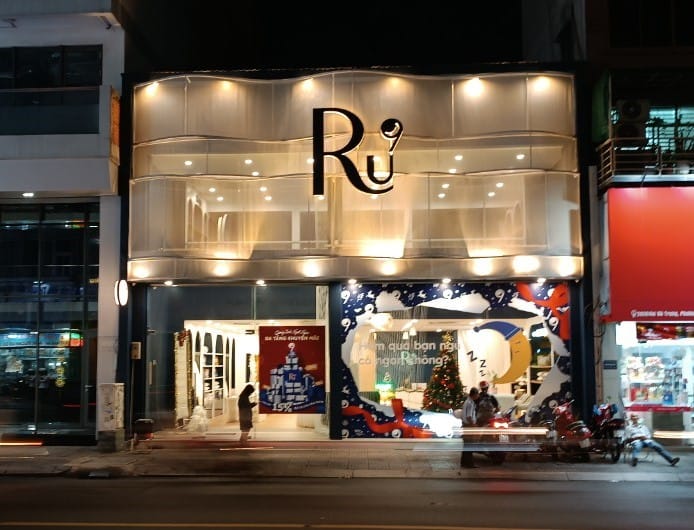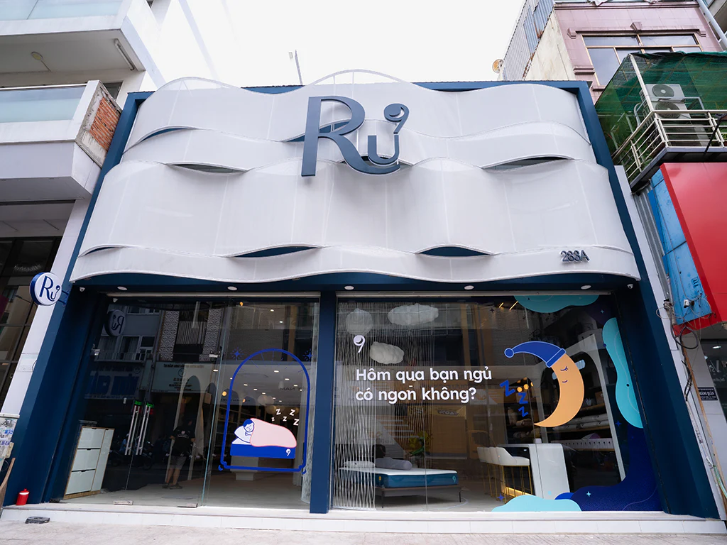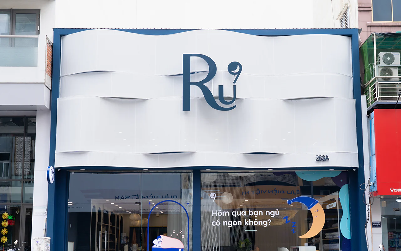 Ru – cửa hàng nệm thiết kế tinh tế với gam màu xanh trầm, điểm nhấn là dải vải mềm mại uốn lượn trước mặt tiền, gợi lên cảm giác nhẹ nhàng, êm ái – đồng điệu với trải nghiệm giấc ngủ chất lượng mà thương hiệu hướng tới.