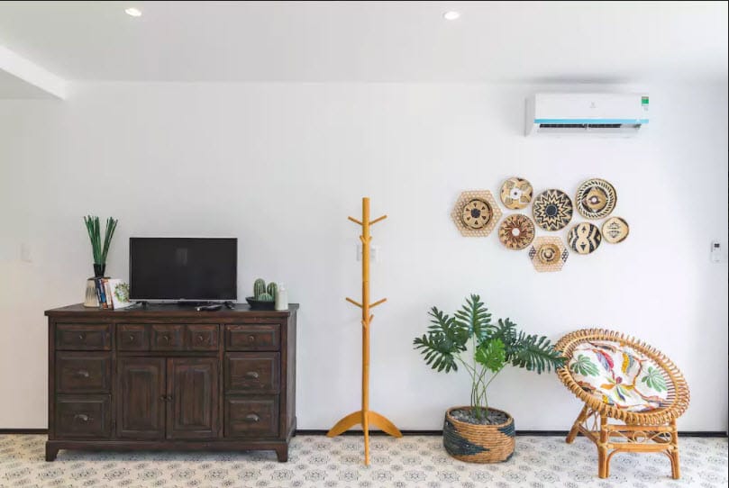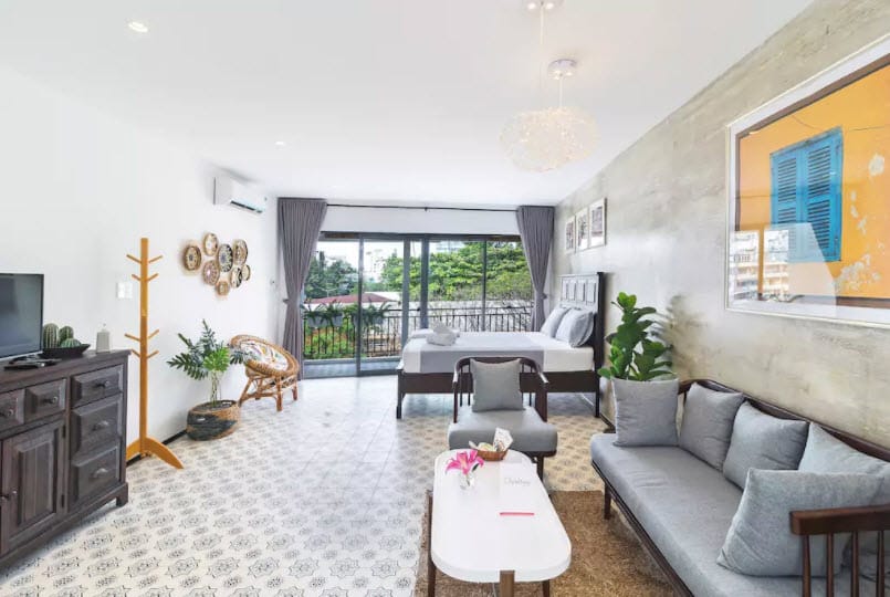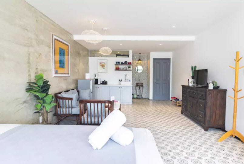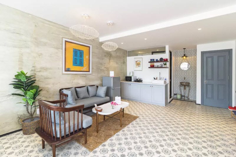 Căn hộ studio được Vuông Tròn Giác lấy cảm hứng từ phong cách Indochine hiện đại, kết hợp tinh tế giữa bóng hoài cổ và tiện nghi đương đại. Không gian ấm cúng với tường xi măng, sàn gạch hoa, nội thất gỗ và đám mây tre, cùng hệ cửa kính lớn ngập dòng ánh sáng tự nhiên.